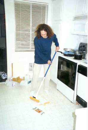 Rich cleans up the mess he made after spilling the noodles all over the kitchen.
